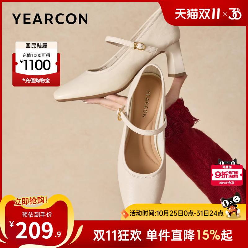 意尔康女鞋2025秋季羊皮玛丽珍鞋方头粗跟法式气质高跟单鞋配裙子