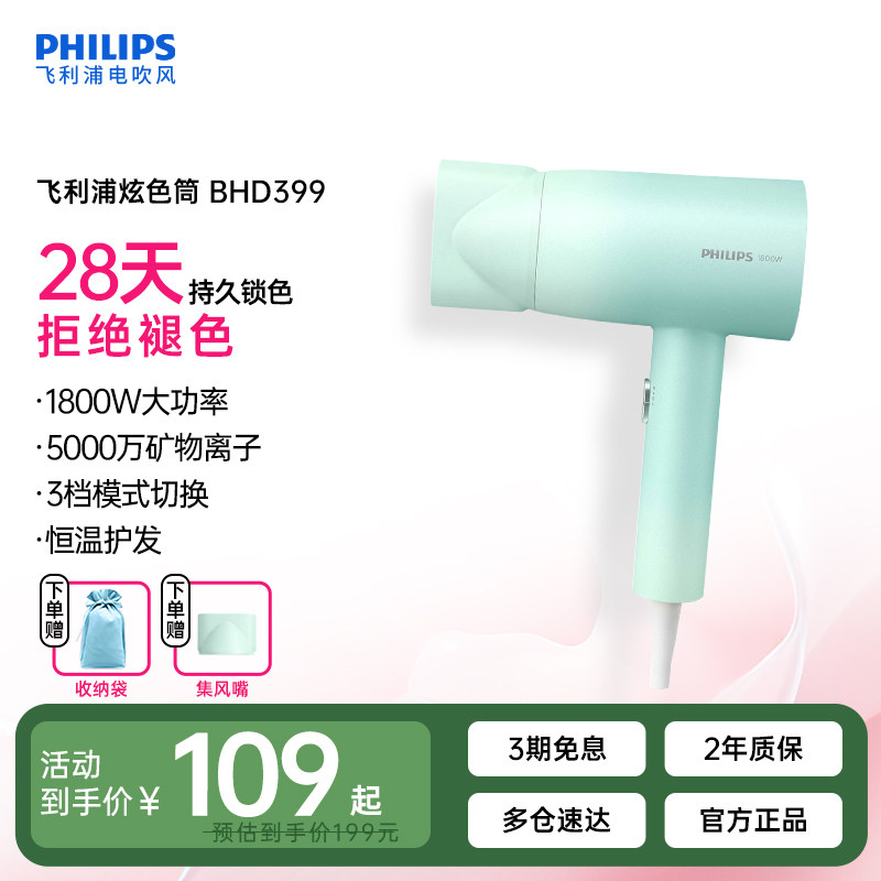 飞利浦电吹风机BHD399速干家用学生大功率BHD356吹风筒负离子护发