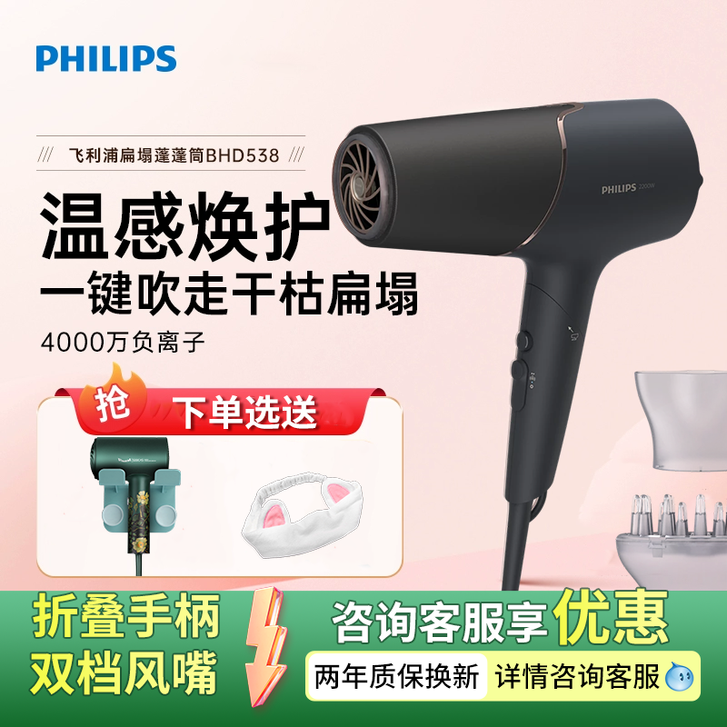 飞利浦电吹风机BHD538家用负离子护发大功率速干2200W恒温吹风筒