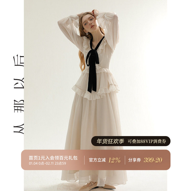 从那以后法式连衣裙长袖长裙高级感裙子白色礼服穿搭冬季伴娘裙女