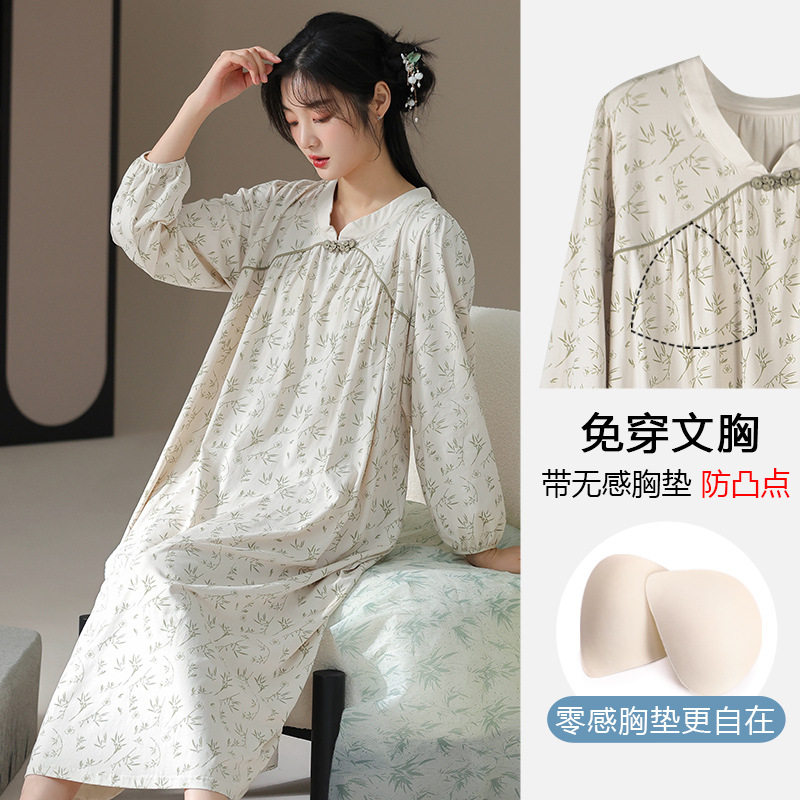 轩靓【带胸垫】2026新款睡裙女春秋纯棉长袖睡衣大码超长裙家居服