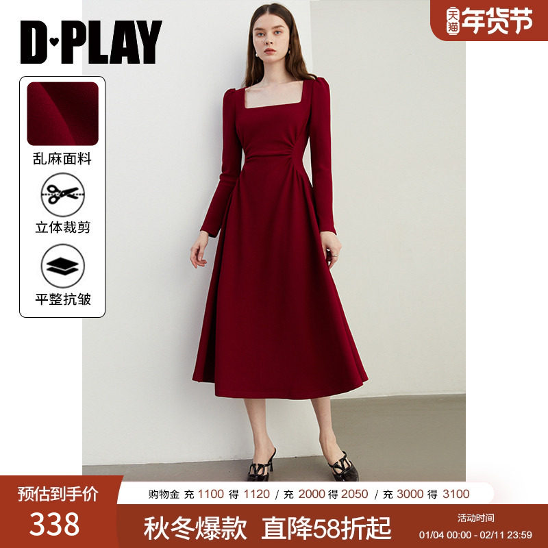 DPLAY2025冬季新款法式方领丝绒红色连衣裙女订婚礼服长裙长袖