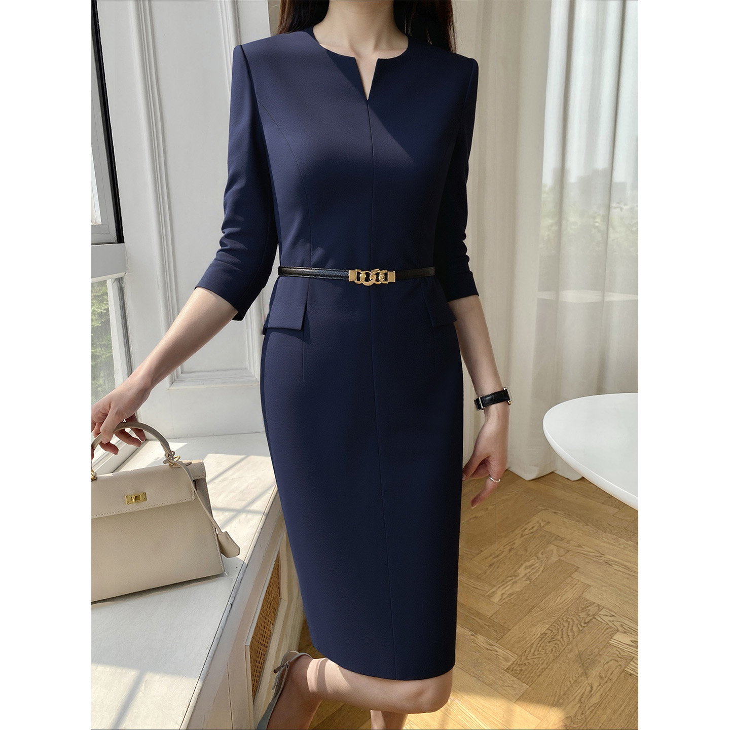 时尚职业装连衣裙V领气质珠宝店美容院物业职业藏青色修身工装裙