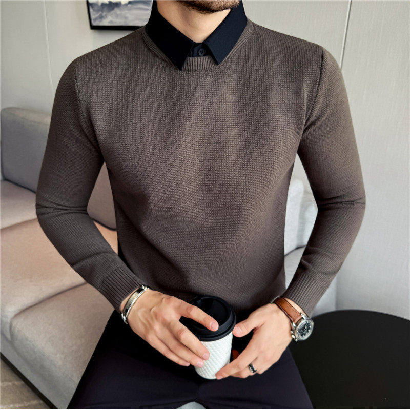 冬季加厚时尚假两件毛衣商务休闲男士保暖衬衫领百搭打底针织衫潮