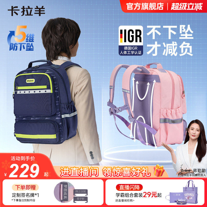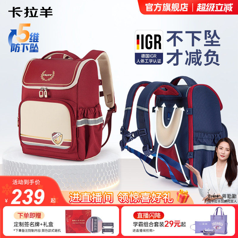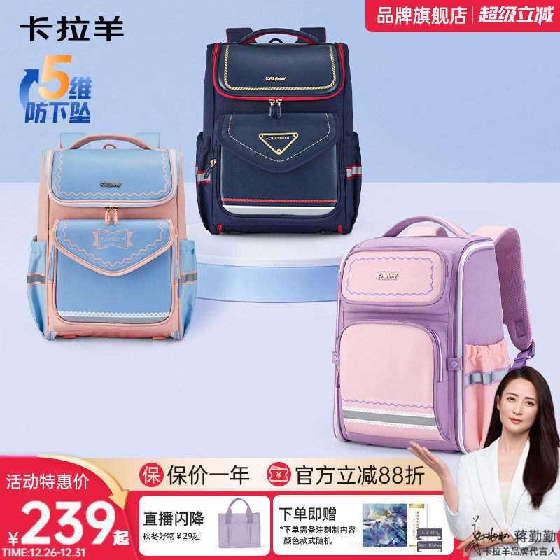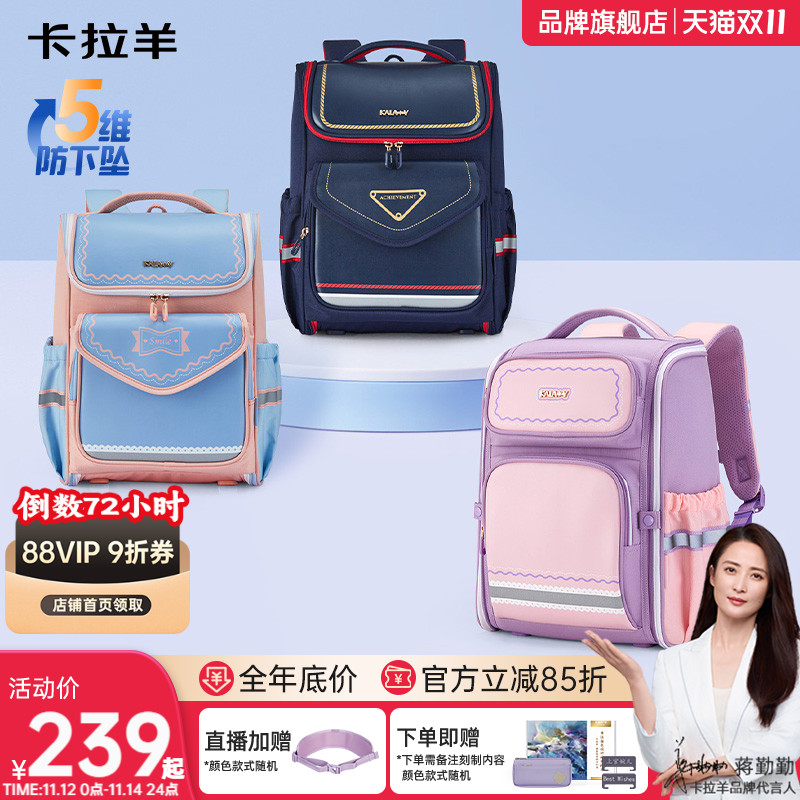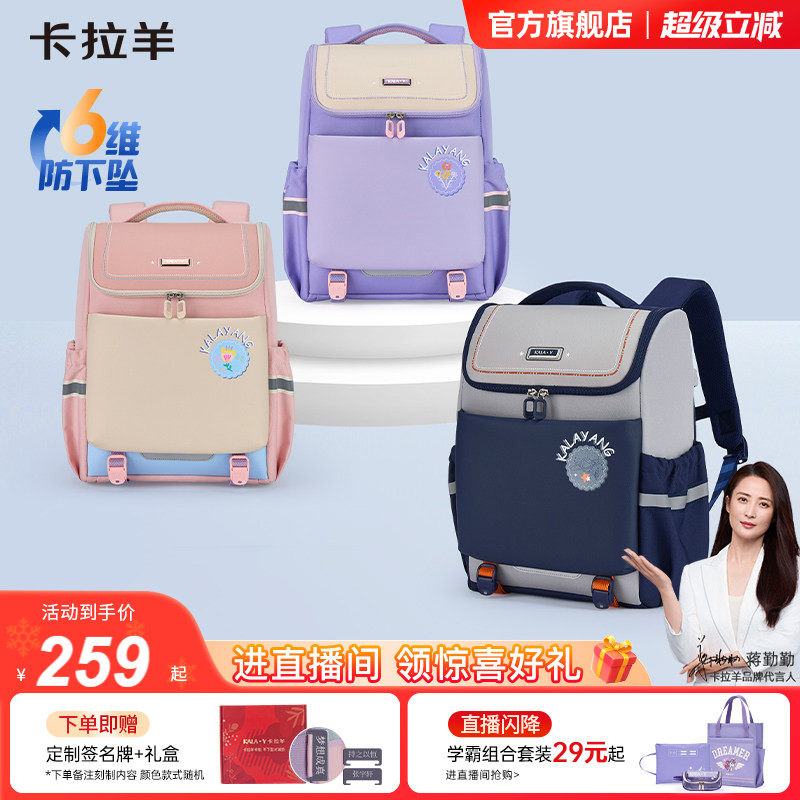 卡拉羊小学生书包女1-3-6年级减负防下坠男生双肩包大容量背包轻便高颜值