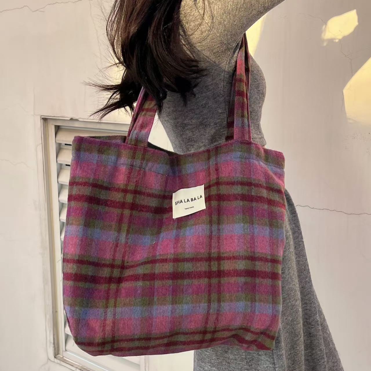 2024秋冬新款复古毛呢格子单肩包大容量帆布包通勤手提包法式布包