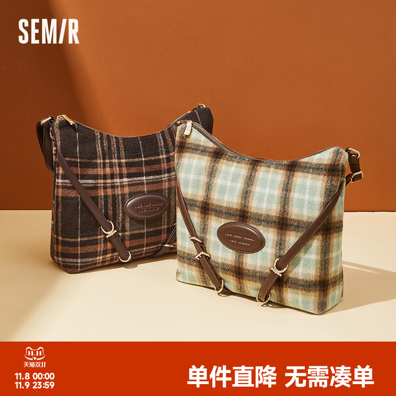 森马包包托特包女2024新款格纹仿毛呢单肩包大容量通勤手提包复古