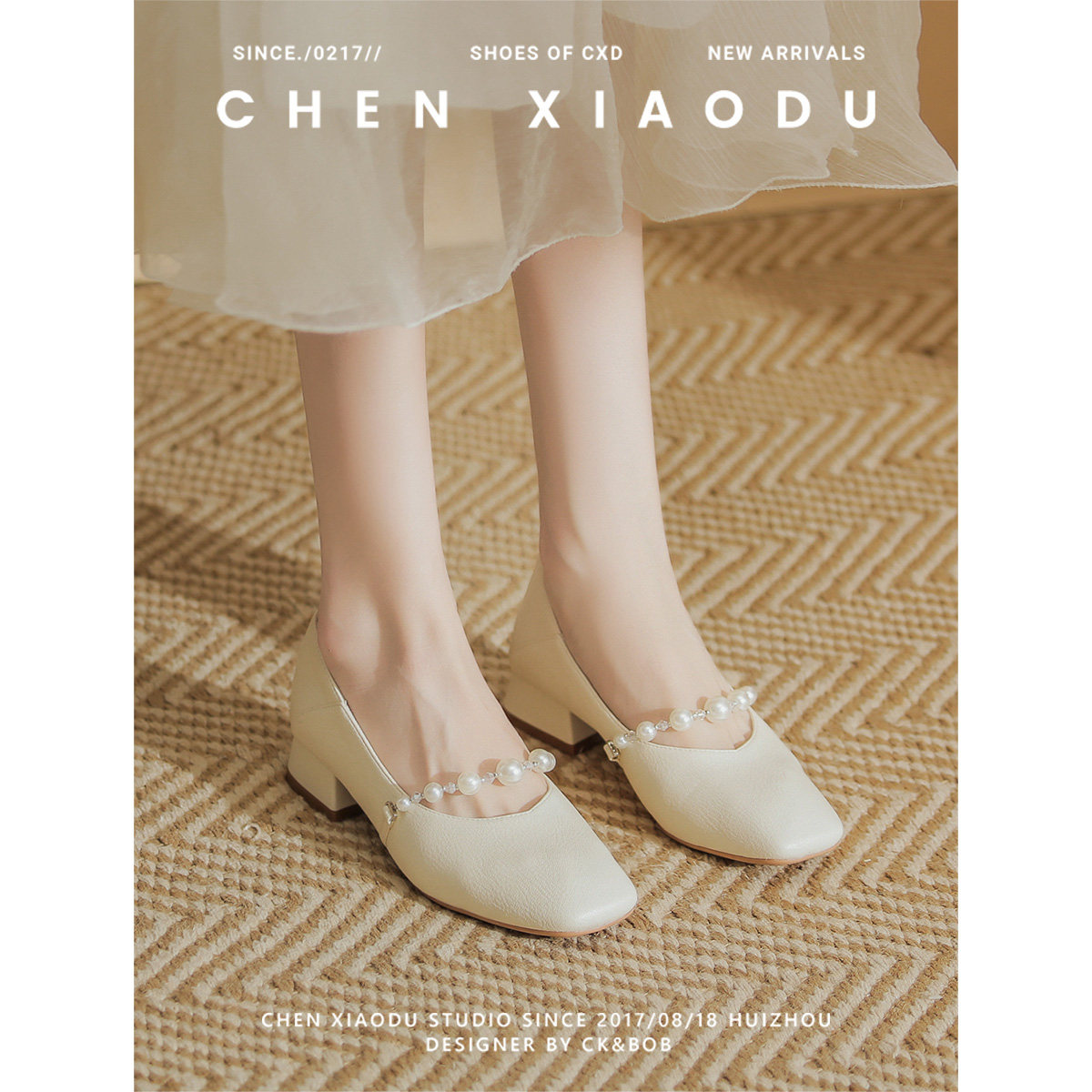 六点大叔真皮粗跟单鞋女2025春季新款珍珠伴娘白色高跟鞋玛丽珍鞋