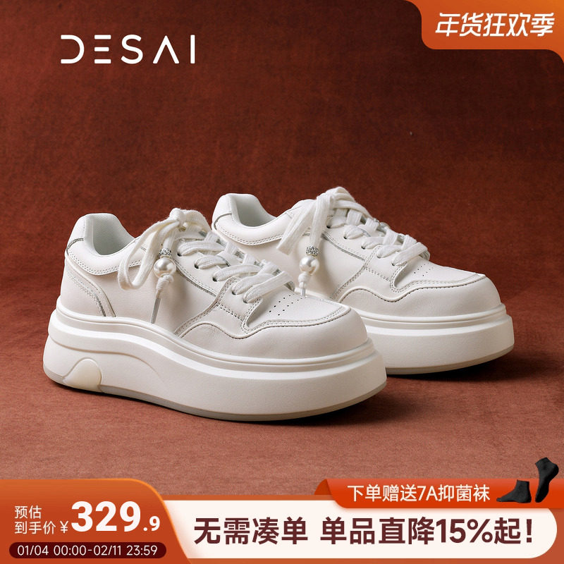 德赛秋冬真皮增高小白鞋女厚底显瘦珍珠鞋带休闲板鞋舒适百搭女鞋