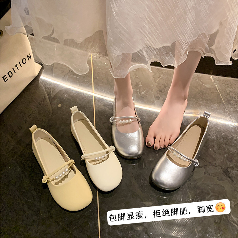 法式一字扣浅口单鞋女2025夏季新款时尚珍珠鞋带百搭舒适软底单鞋