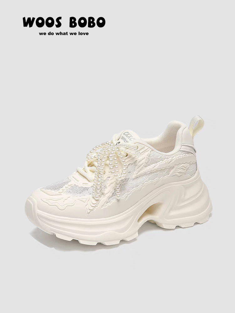 蕾丝厚底老爹鞋女2025夏季新款增高网面透气休闲运动女鞋珍珠鞋带
