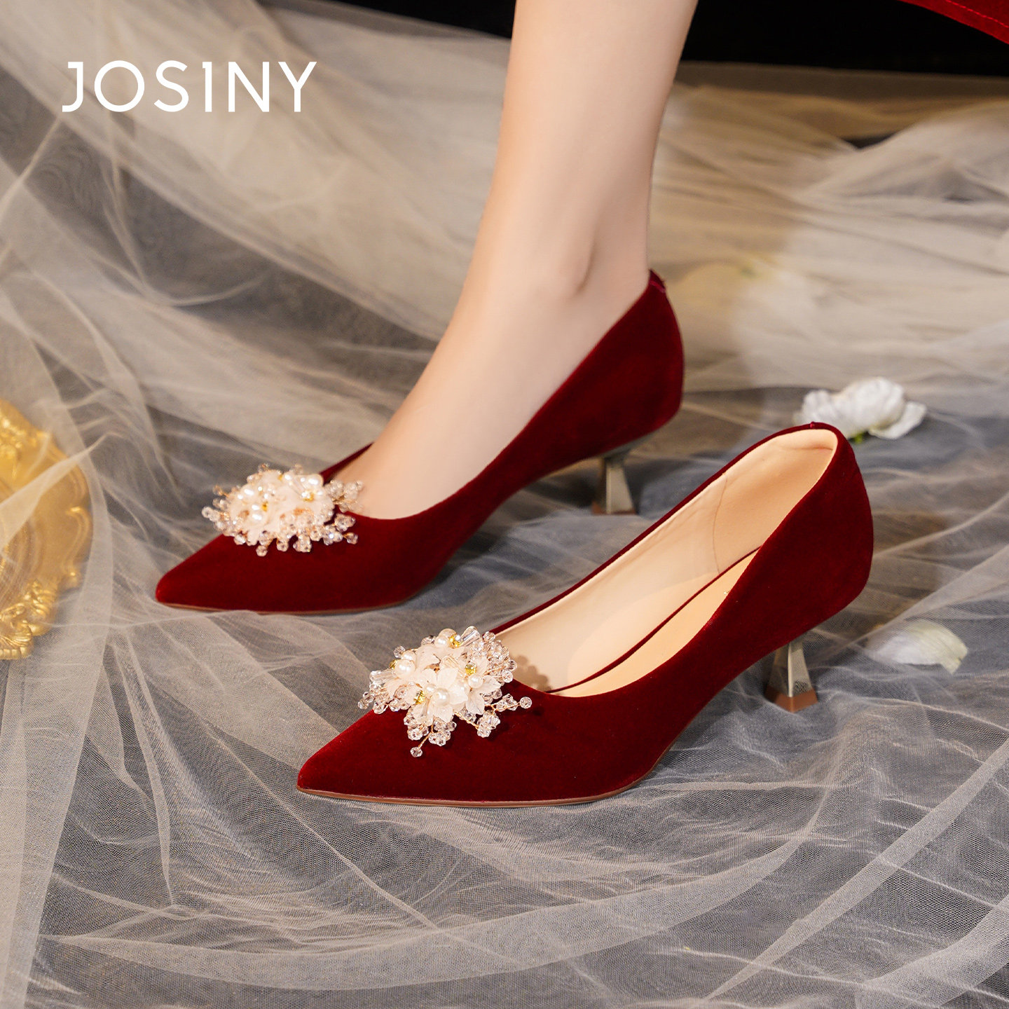 法式红色珍珠带玛丽珍婚鞋新娘鞋2025春秋新款气质绒面粗跟高跟鞋