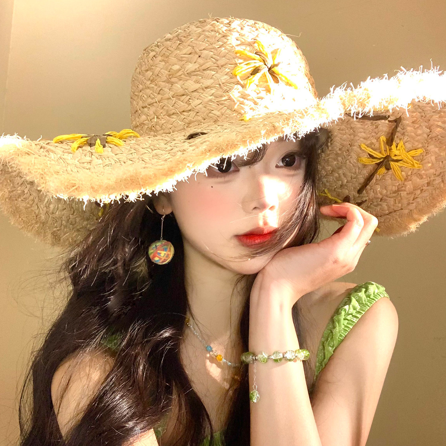 小雏菊毛边拉菲草帽女夏季大帽檐遮阳防晒帽海边沙滩度假太阳帽子