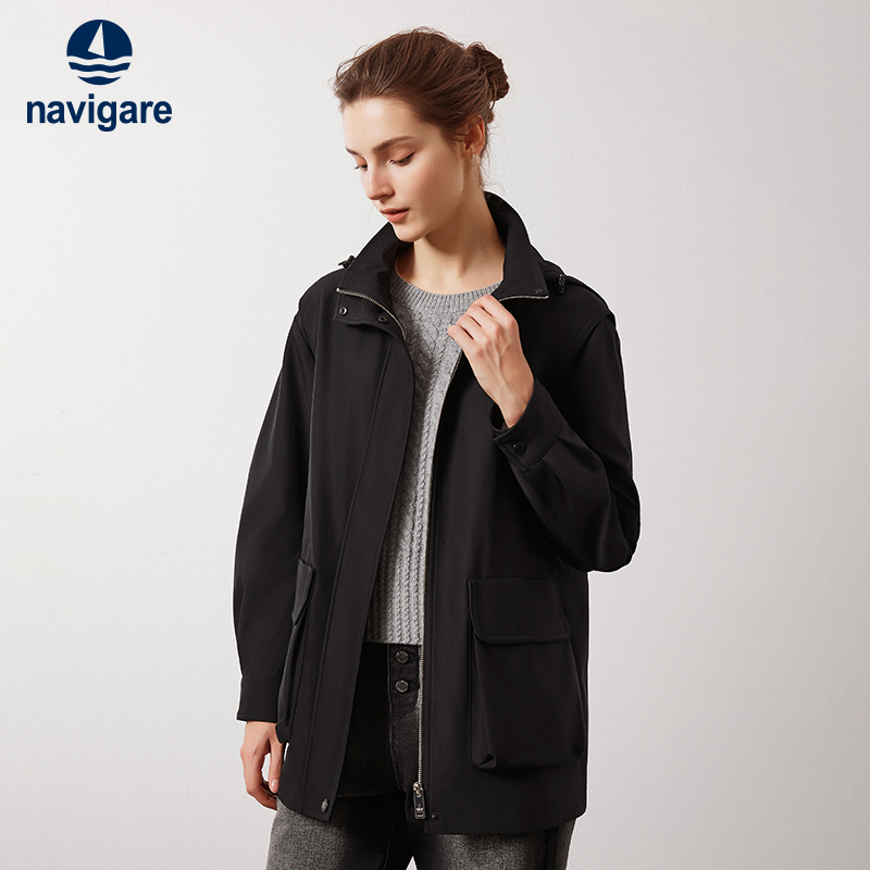 Navigare意大利小帆船黑色中长款风衣女秋季百搭休闲设计感外套