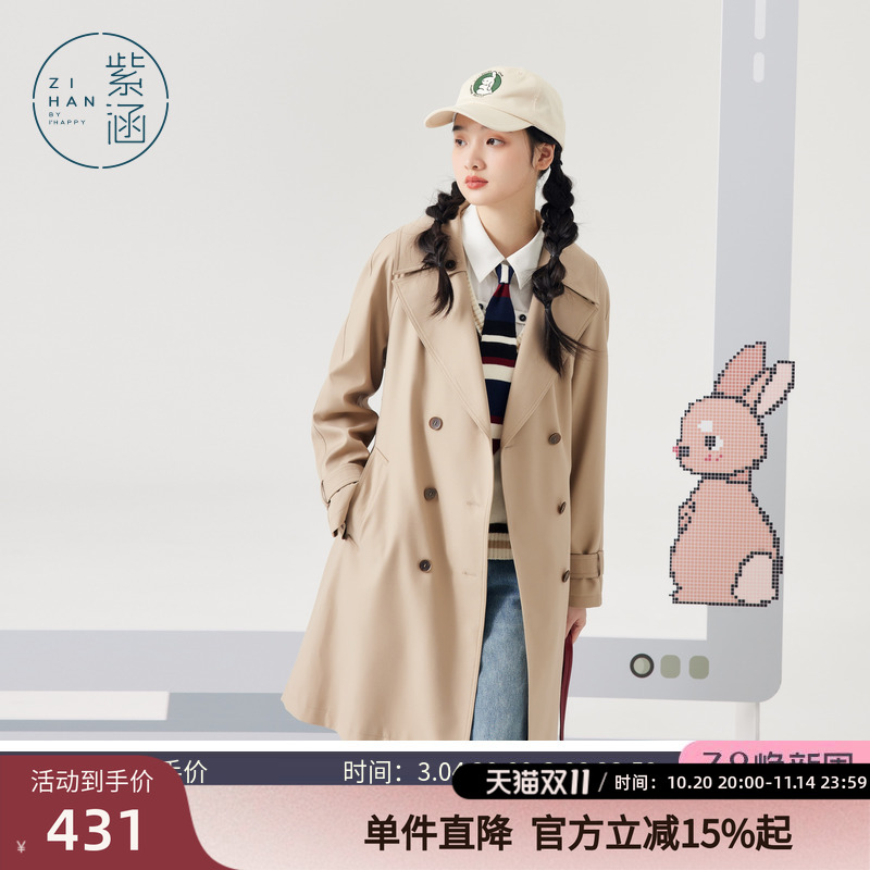 紫涵翻驳领中长款风衣女春秋新款简约英伦风学院风小个子气质外套