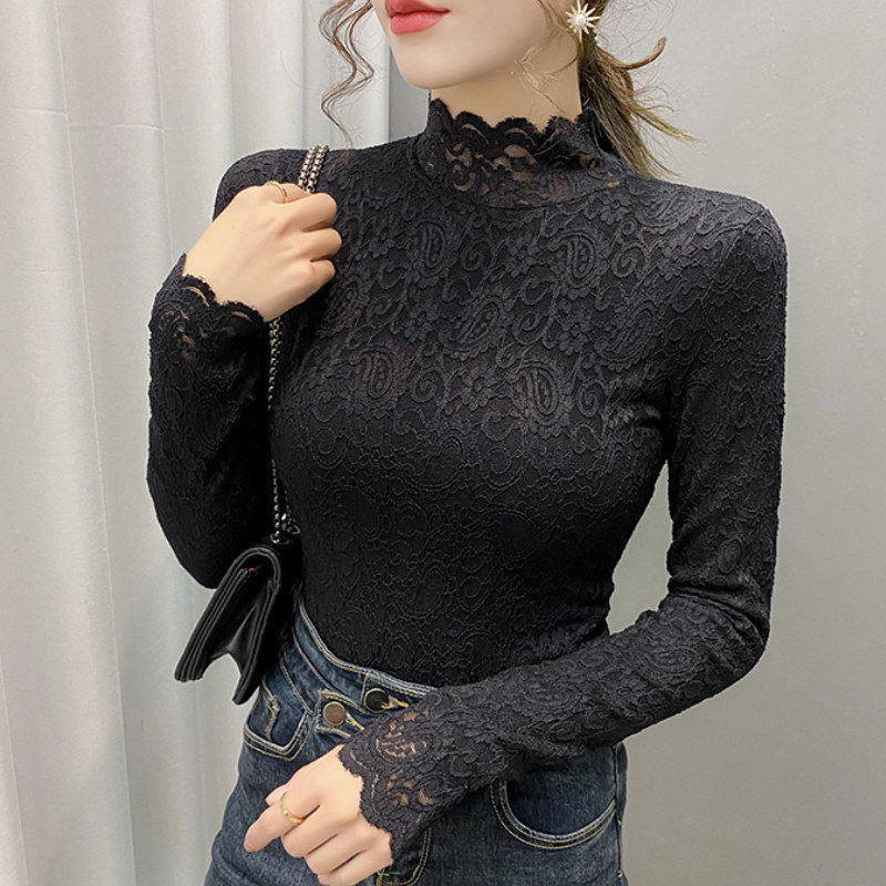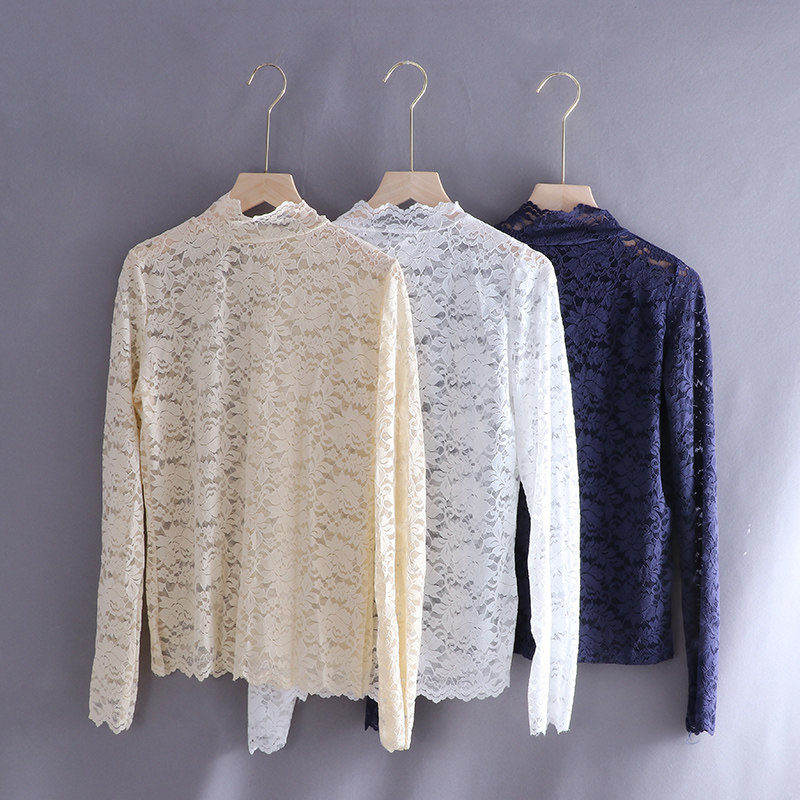 欧货花边半高领蕾丝打底衫内搭2020春款洋气外穿套头网纱上衣