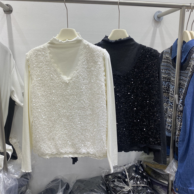 法式冬春款蕾丝花边亮片半高领针织衫女长袖叠穿打底衫两件套上衣