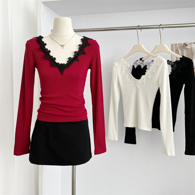 2025春款新款蕾丝拼接V领磨毛打底衫女修身秋季内搭长袖性感上衣