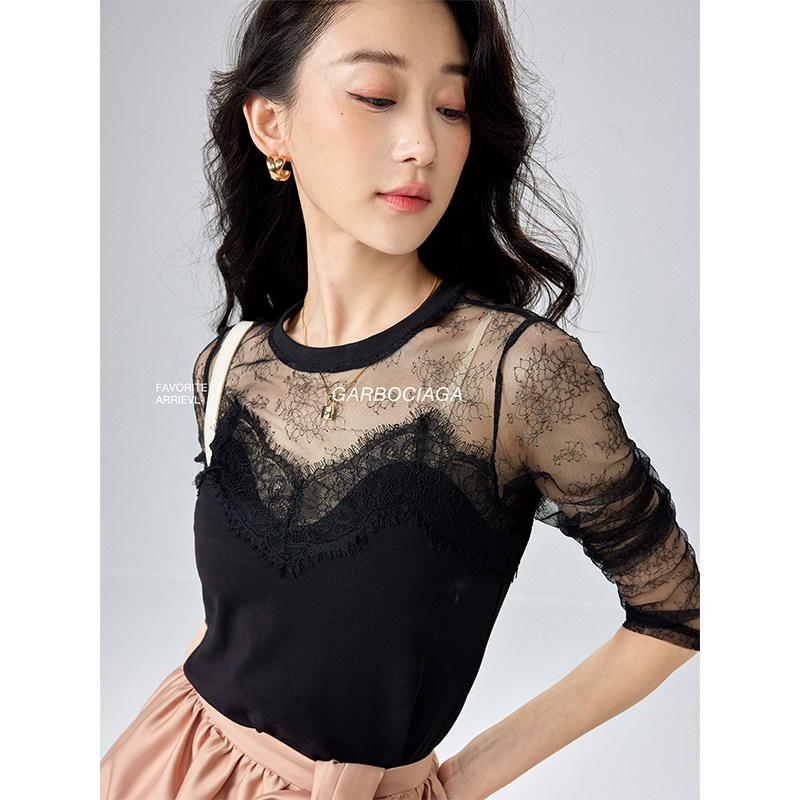 Garbociaga龙喜儿 25春款气质睫毛蕾丝针织弹力打底衫 6555