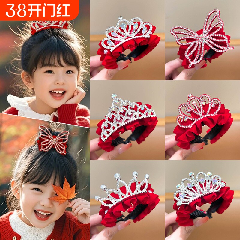 新年儿童头饰发饰皇冠发夹女童丸子头马尾扣发卡红色喜庆女孩过年