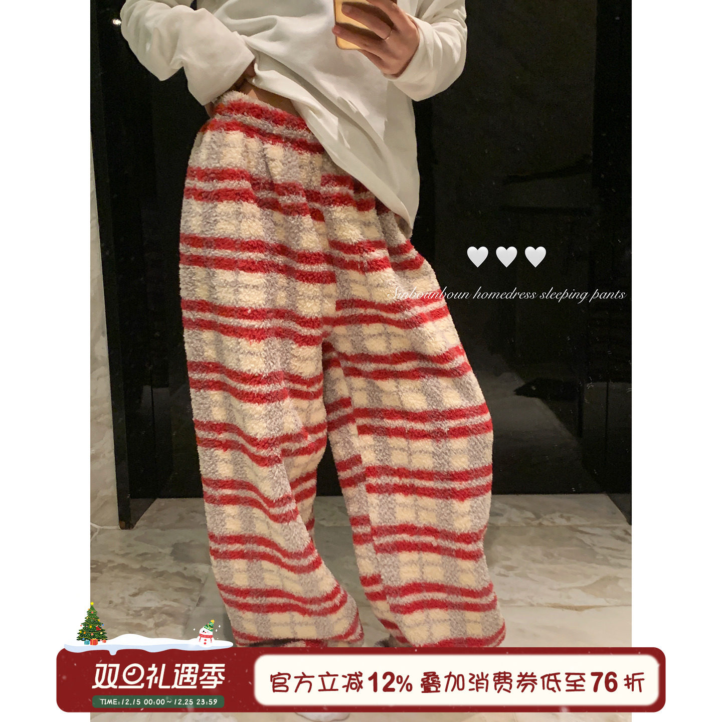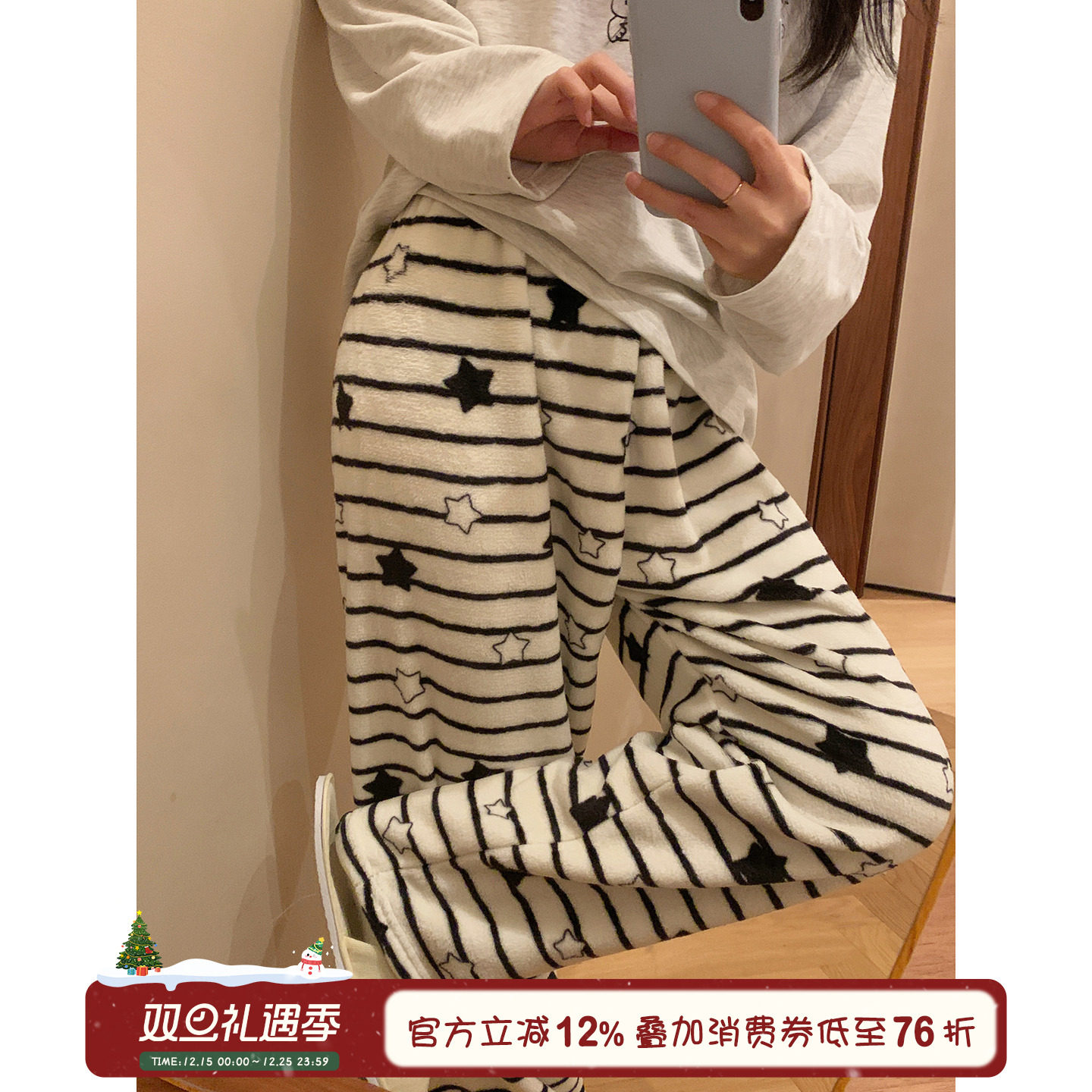 馨帮帮Homedress 星星条纹珊瑚绒睡裤女休闲保暖遛弯宽松家居长裤