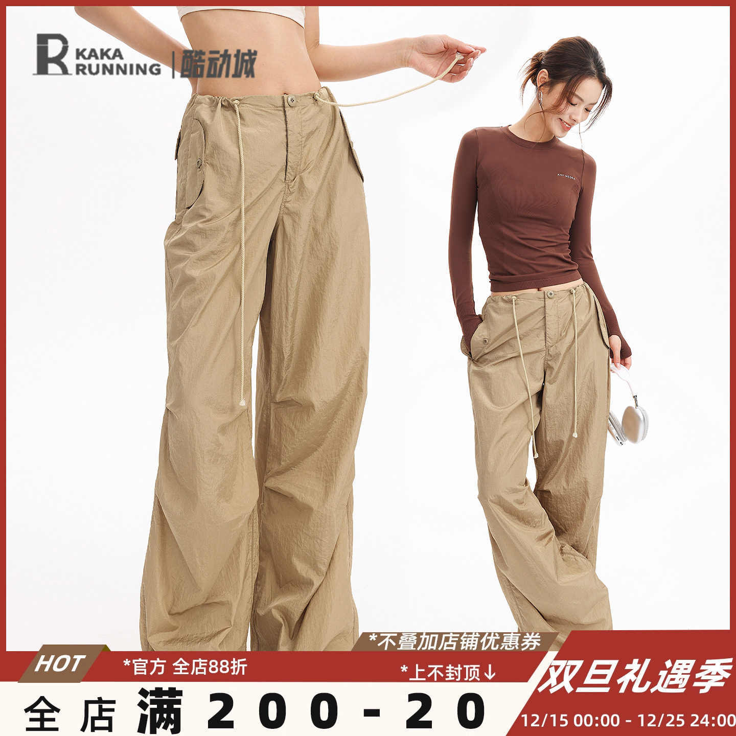 花花家韩系2025秋冬新款松紧腰抽绳弯刀裤女休闲百搭显瘦阔腿卫裤
