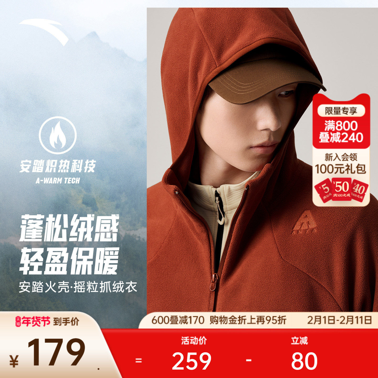 安踏火壳抓绒衣外套男2025冬季加绒保暖马年新年户外红色运动上衣