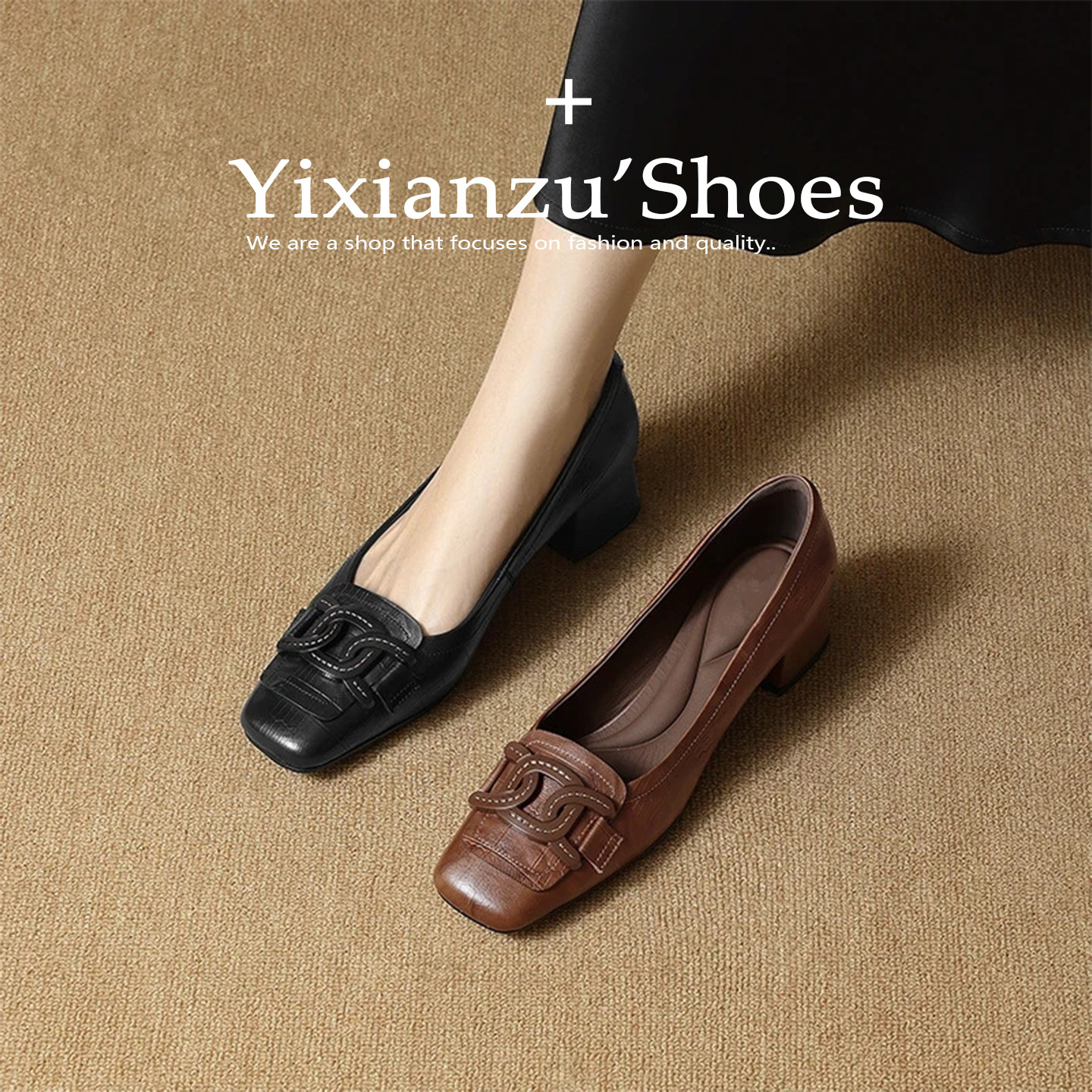 老人头头层牛皮单鞋女春秋季真皮粗跟工作鞋子女英伦浅口通勤鞋女