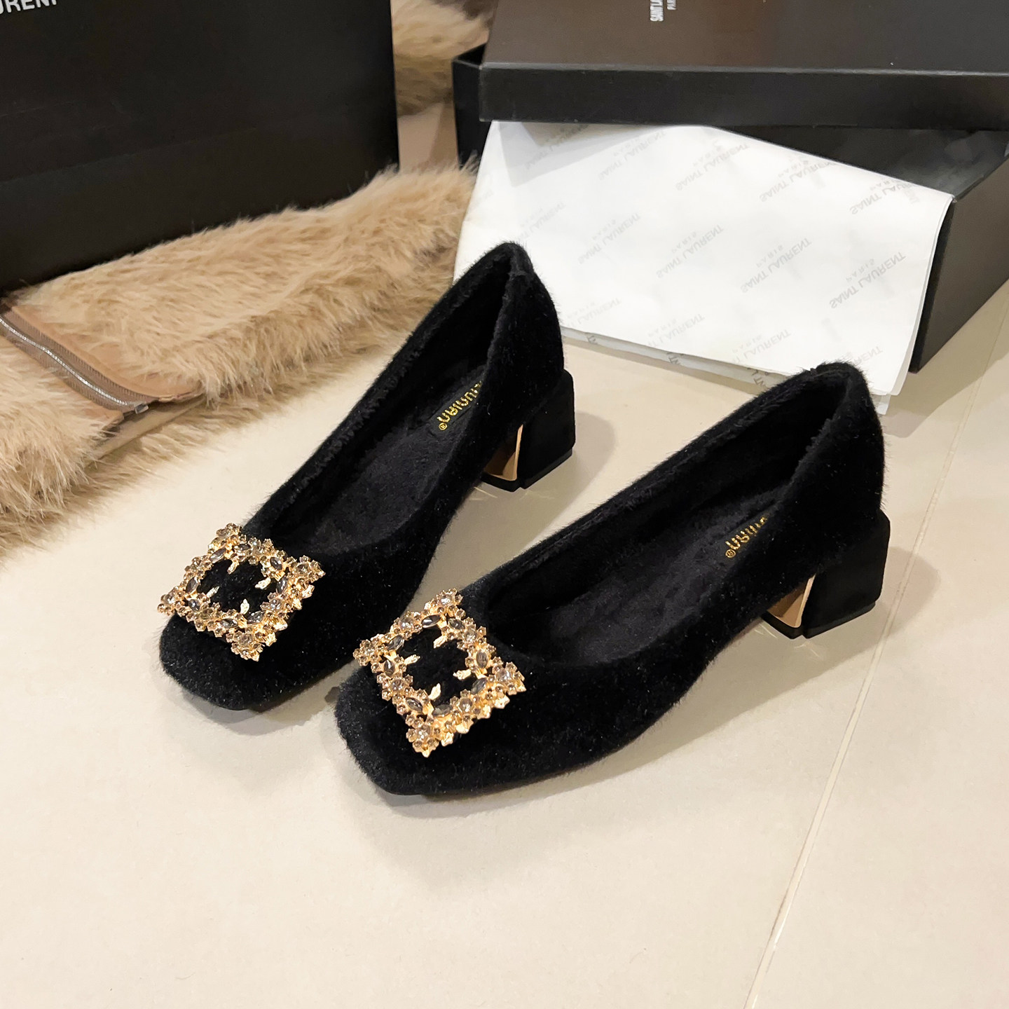 法式加绒高跟鞋女2025冬新款毛毛鞋中跟职业方头粗跟工作鞋豆豆鞋
