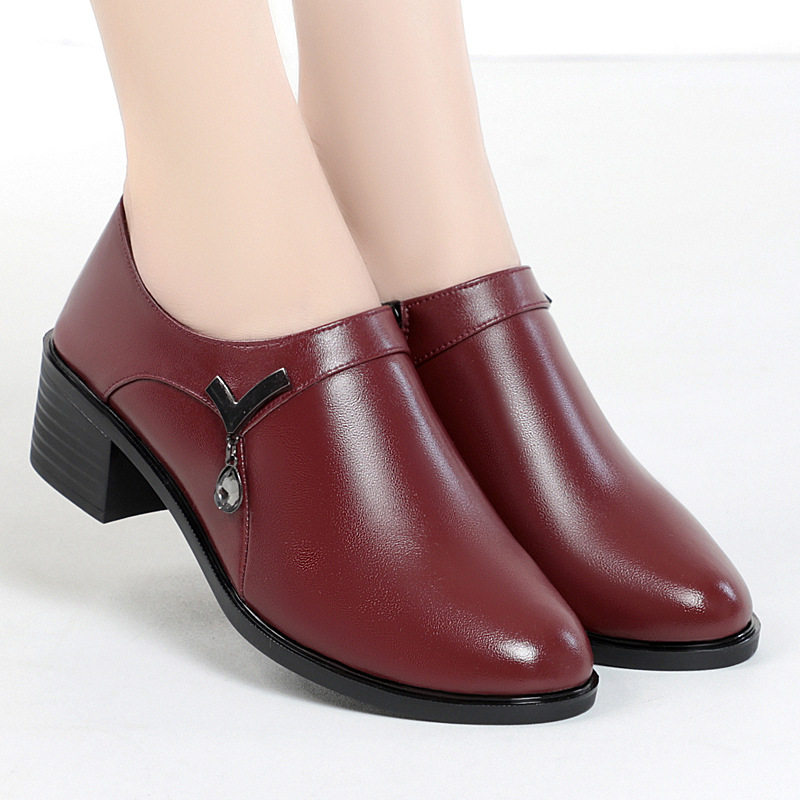 2025春秋新款高跟深口单鞋女鞋真皮软底时尚妈妈鞋子女粗跟工作鞋
