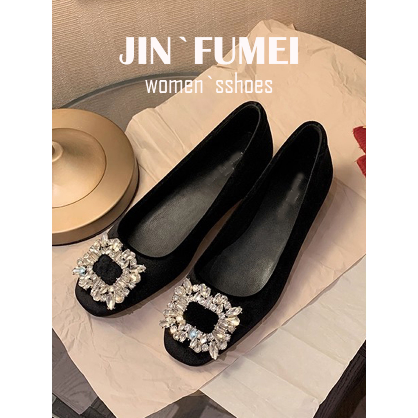 路佳林庄园酒会~方头钻扣浅口丝绒平底单鞋女通勤婚鞋粗跟工作鞋