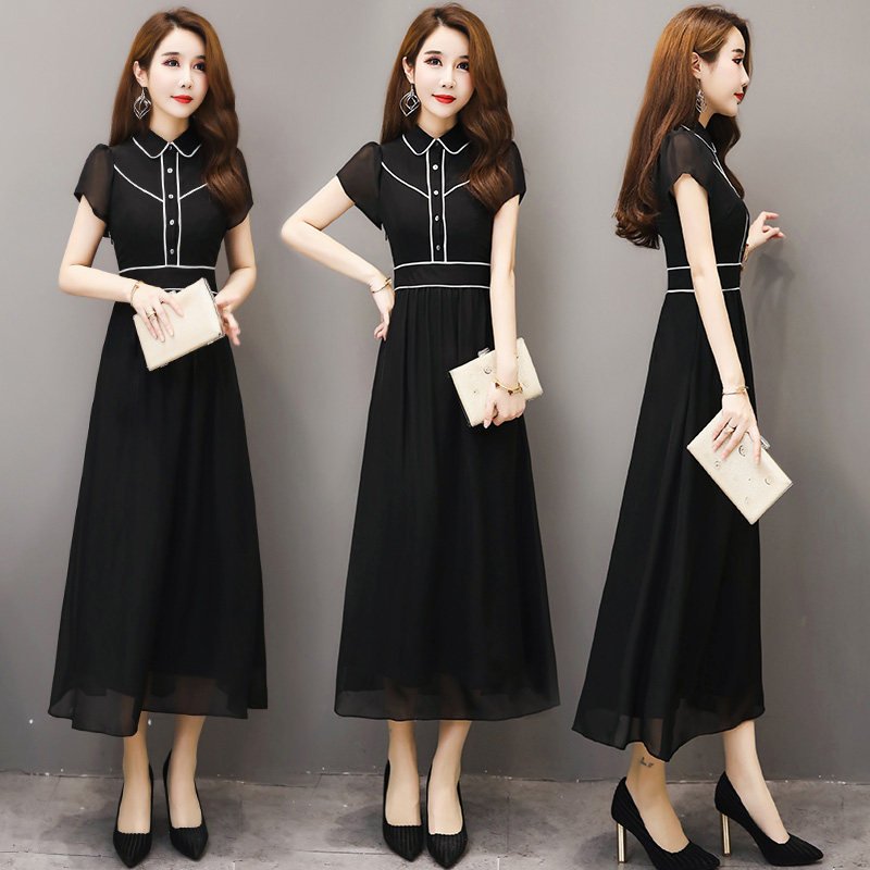 衬衫雪纺连衣裙长款黑色夏收腰显瘦气质夏装2021新款衬衣女长裙子