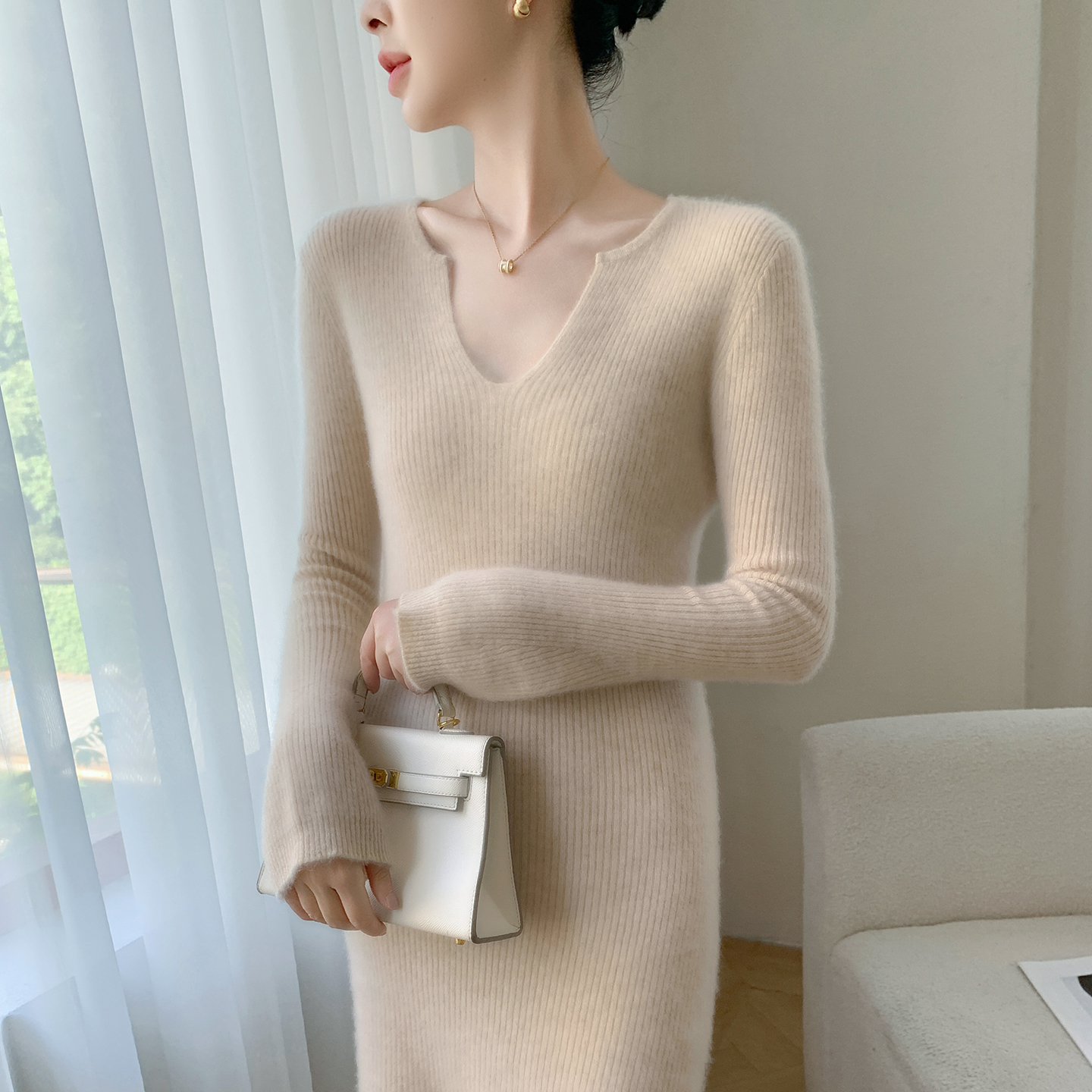 秋冬中长款羊绒衫女V领修身显瘦针织过膝连衣裙女士保暖毛衣裙子