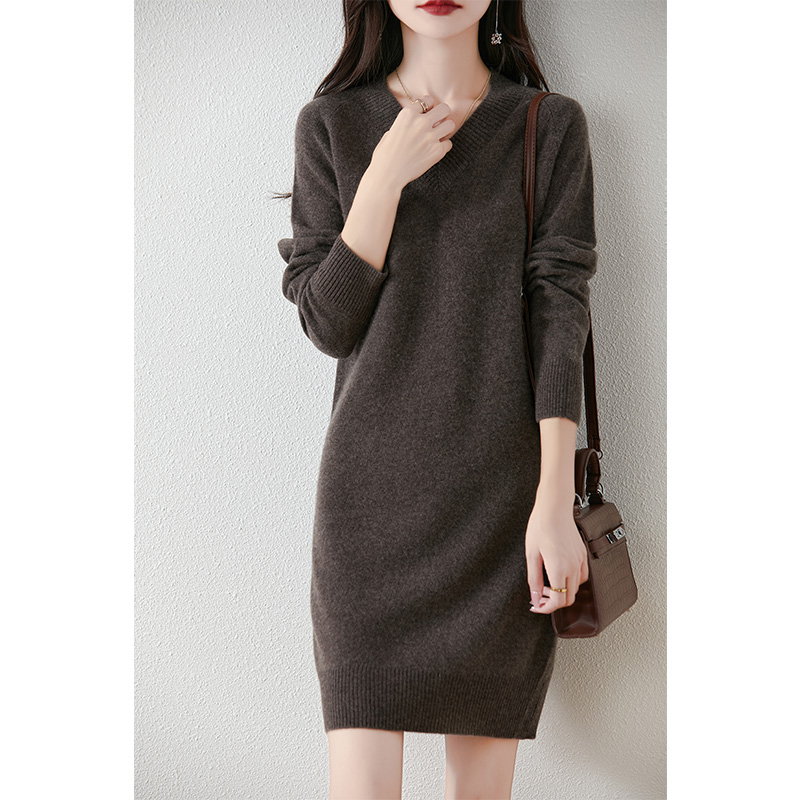100%纯羊毛衫女针织连衣裙中长款V领修身毛衣冬羊绒过膝气质长裙