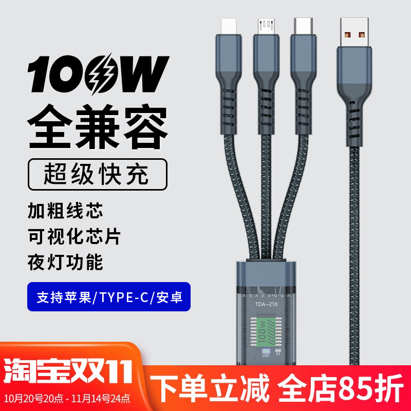 100W超级快充三合一充电线6A适用苹果华为安卓手机通用一拖三数据线透明芯片type-c带灯