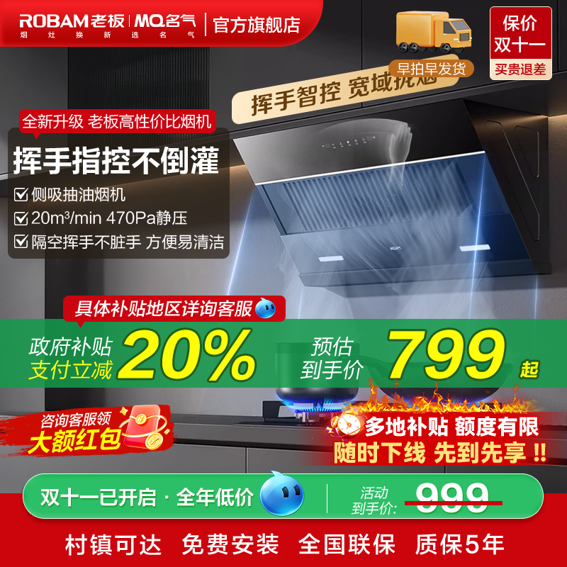 【政府补贴】老板名气侧吸式抽吸油烟机家用厨房大吸力脱排A311