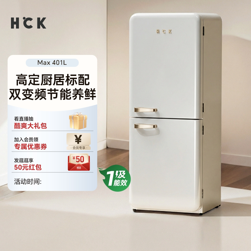 HCK哈士奇401LMax2.0厨房冰箱双门复古深冷速冻家用风冷一级能效