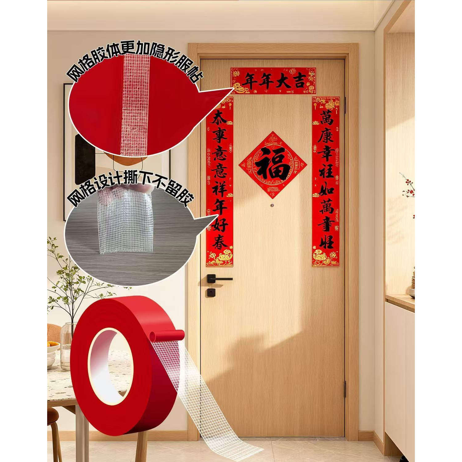 贴春联对联双面胶带撕下不留痕迹红色网格布基双面无痕胶布婚庆婚房装饰气球喜字福字年画高粘度强力固定墙面