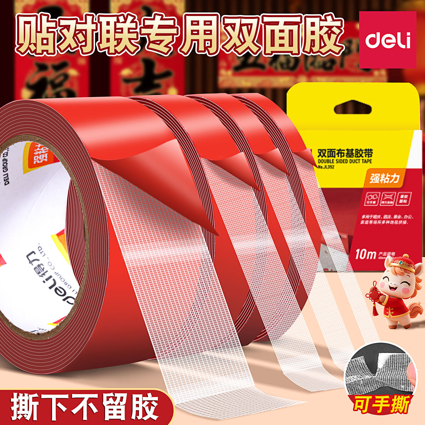 得力网格布基胶带贴对联双面胶带强力粘贴可手撕不留胶红色贴春联专用纳米胶强力固定不易伤墙婚庆地毯布置