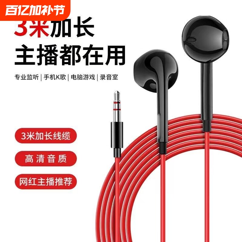 台式电脑耳机有线入耳2米3米延长耳麦考试听力用耳塞3.5mm圆插头