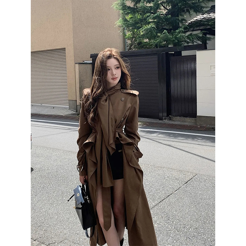 英伦风风衣女秋季名媛气质重工围巾领双排扣系带收腰不对称长外套