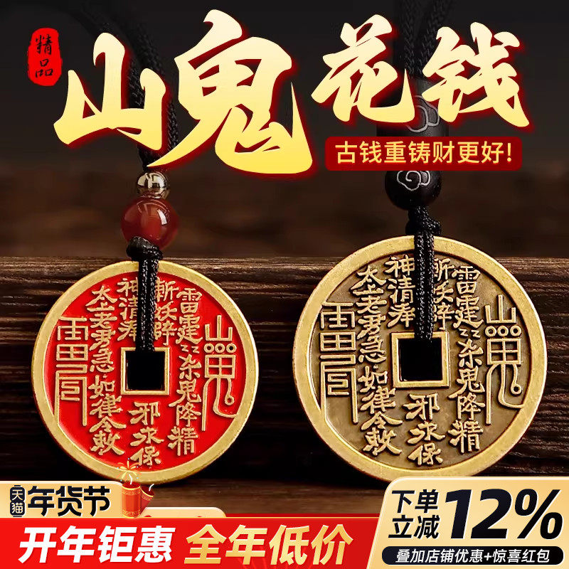 山鬼花钱吊坠黄铜真品仿古钱币项链朱砂八卦铜钱平安扣男女龙虎山
