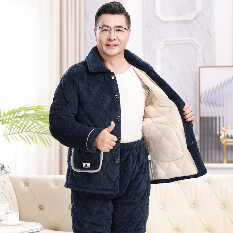 冬季中老年珊瑚绒睡衣男士加厚加绒爸爸法兰绒三层夹棉老人家居服