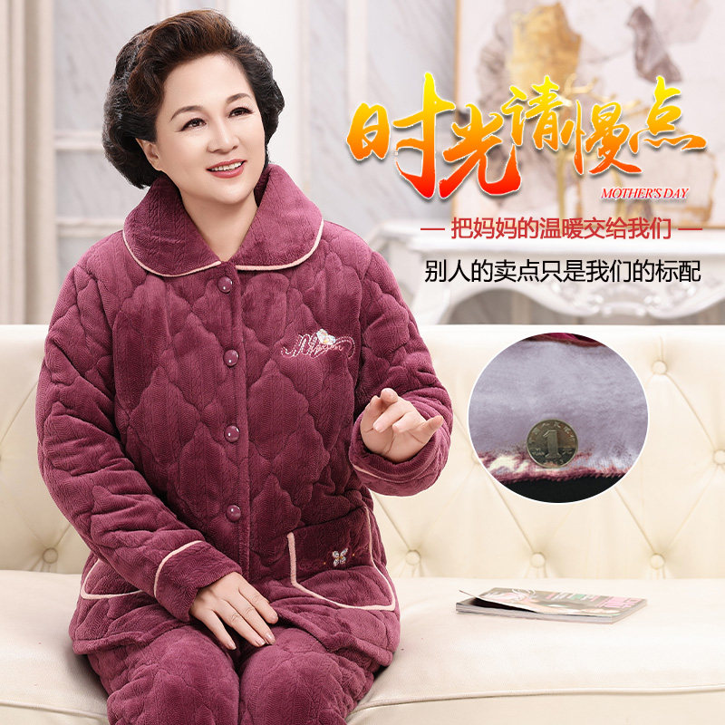 冬季睡衣女珊瑚绒夹棉保暖三层加厚婆婆中老年老人套装妈妈家居服