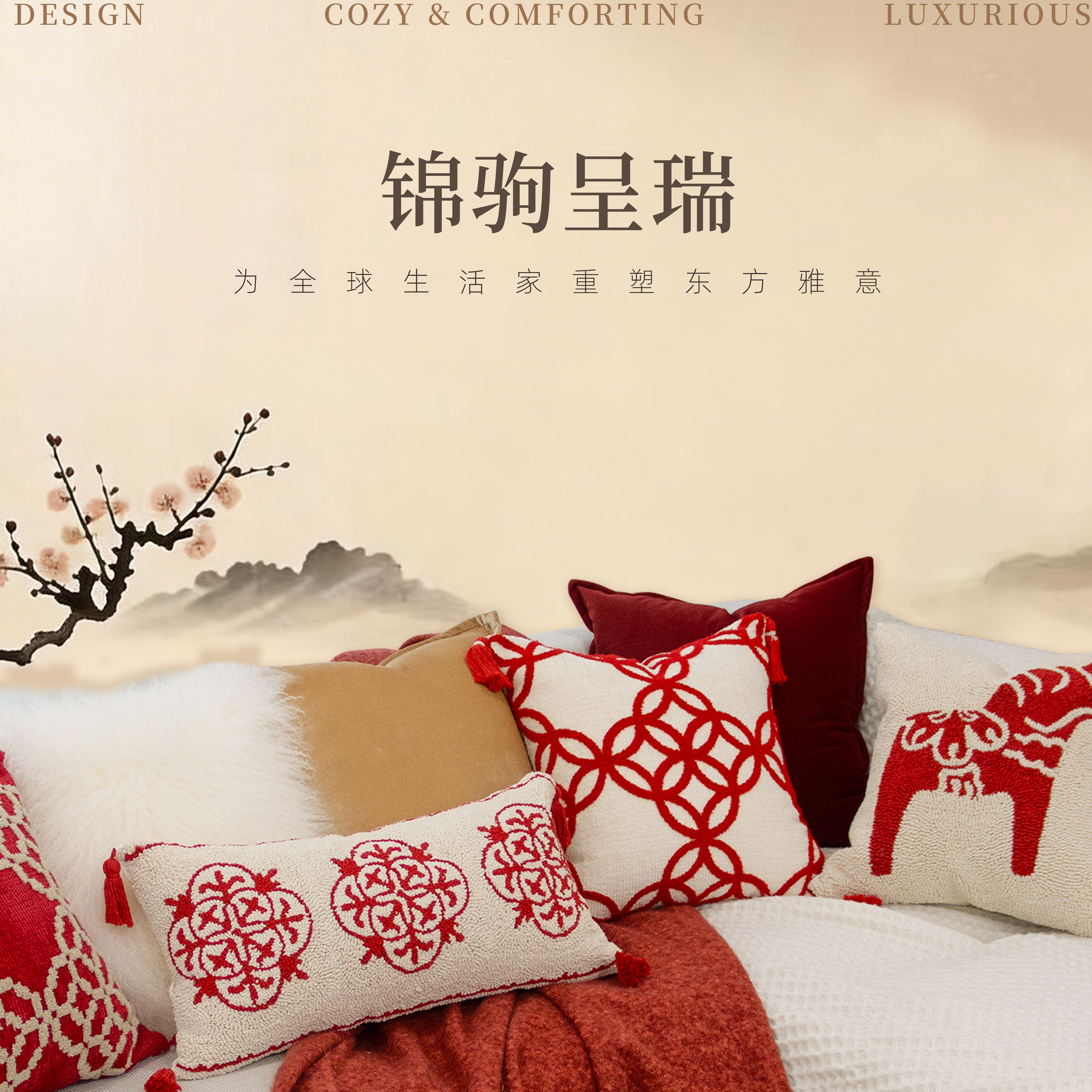 萬見「锦驹呈瑞」法式马年高级红抱枕新中式轻奢靠枕喜庆乔迁软装