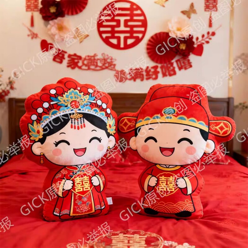 中式古风婚庆陪嫁一对压床娃娃毛绒抱枕婚房布置床头靠垫沙发卧室