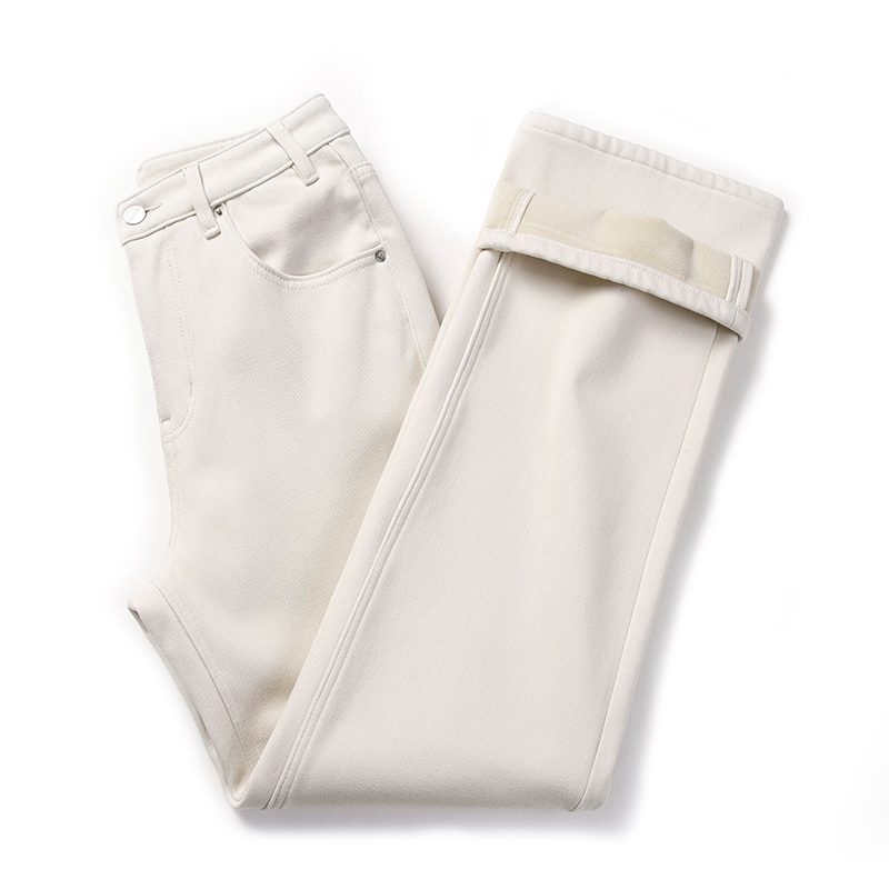米白色加绒窄版直筒牛仔裤女2025年冬季新款加厚保暖休闲阔腿长裤