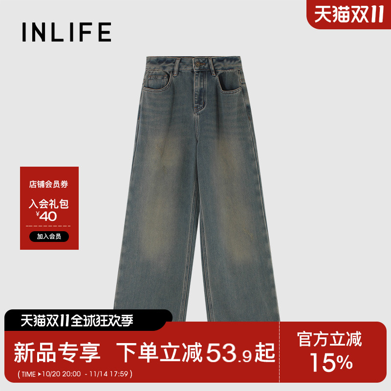 伊纳芙复古高腰直筒牛仔裤女冬季新款美式宽松加绒阔腿裤垂感长裤