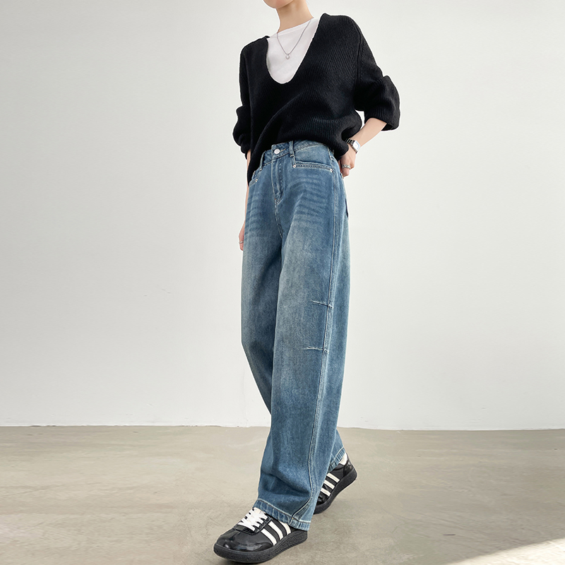 吴童童复古高腰阔腿直筒牛仔裤女秋季韩系高级感宽松显瘦拖地长裤
