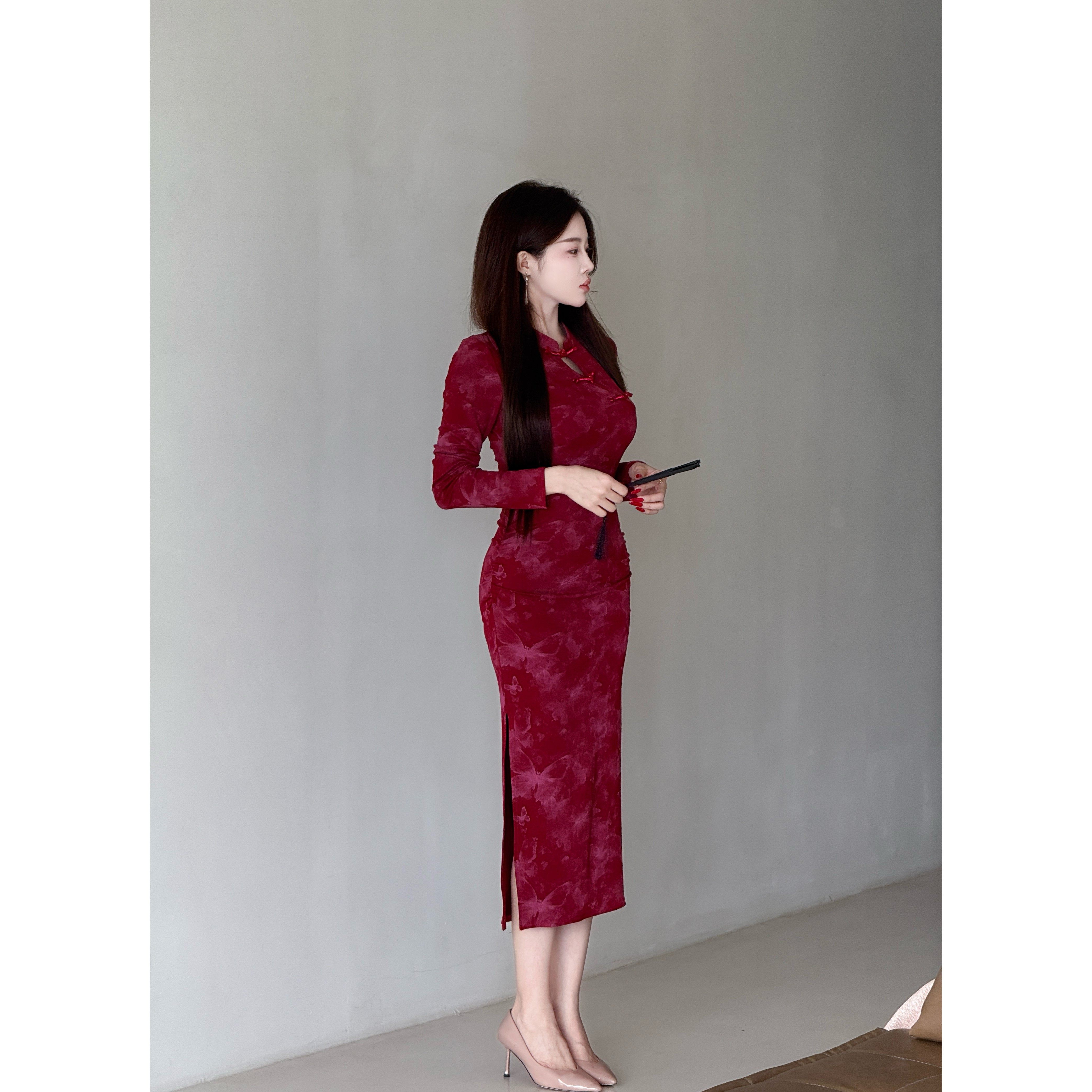【衣雅优选】8082-816# 新款长袖气质显瘦弹力缎面盘扣旗袍连衣裙
